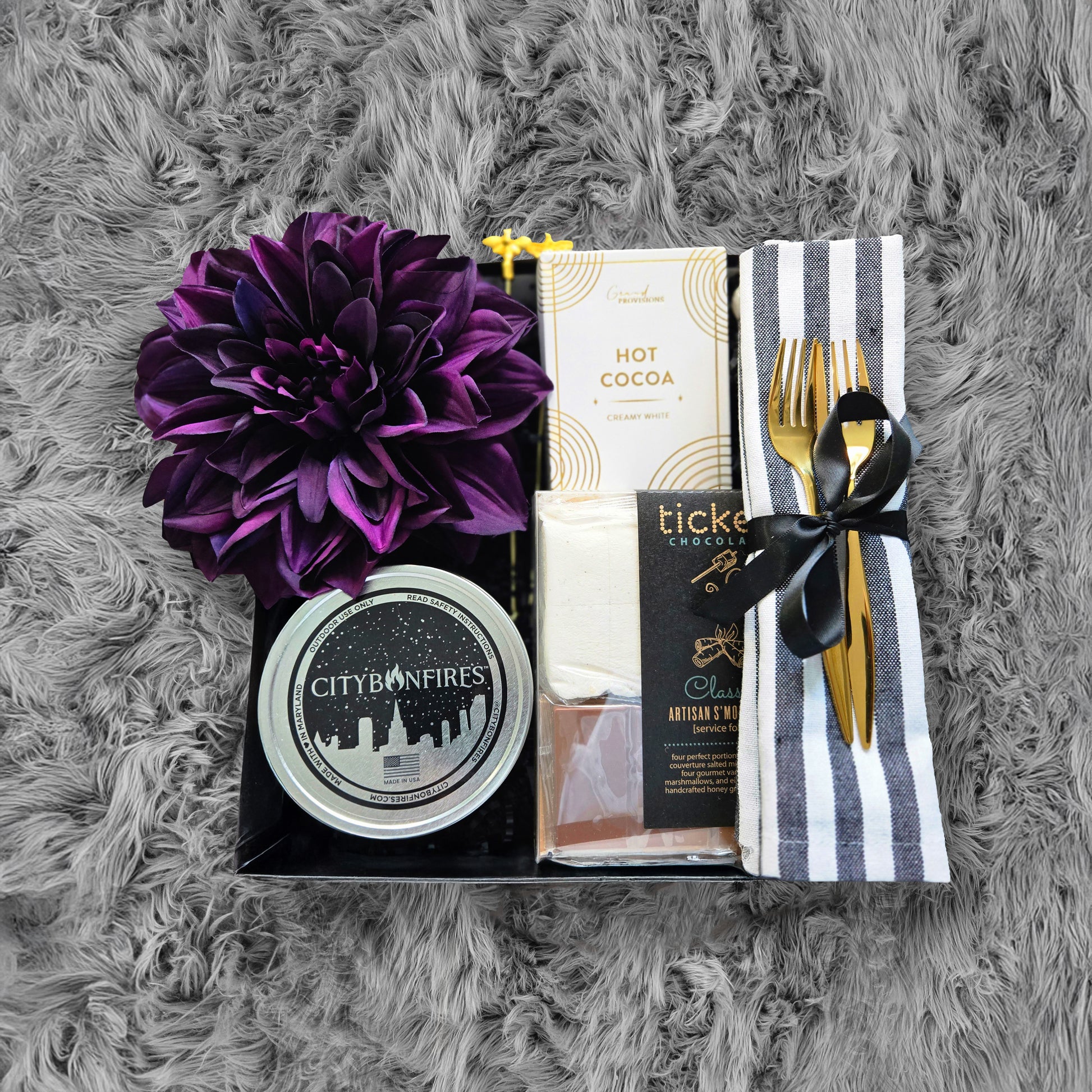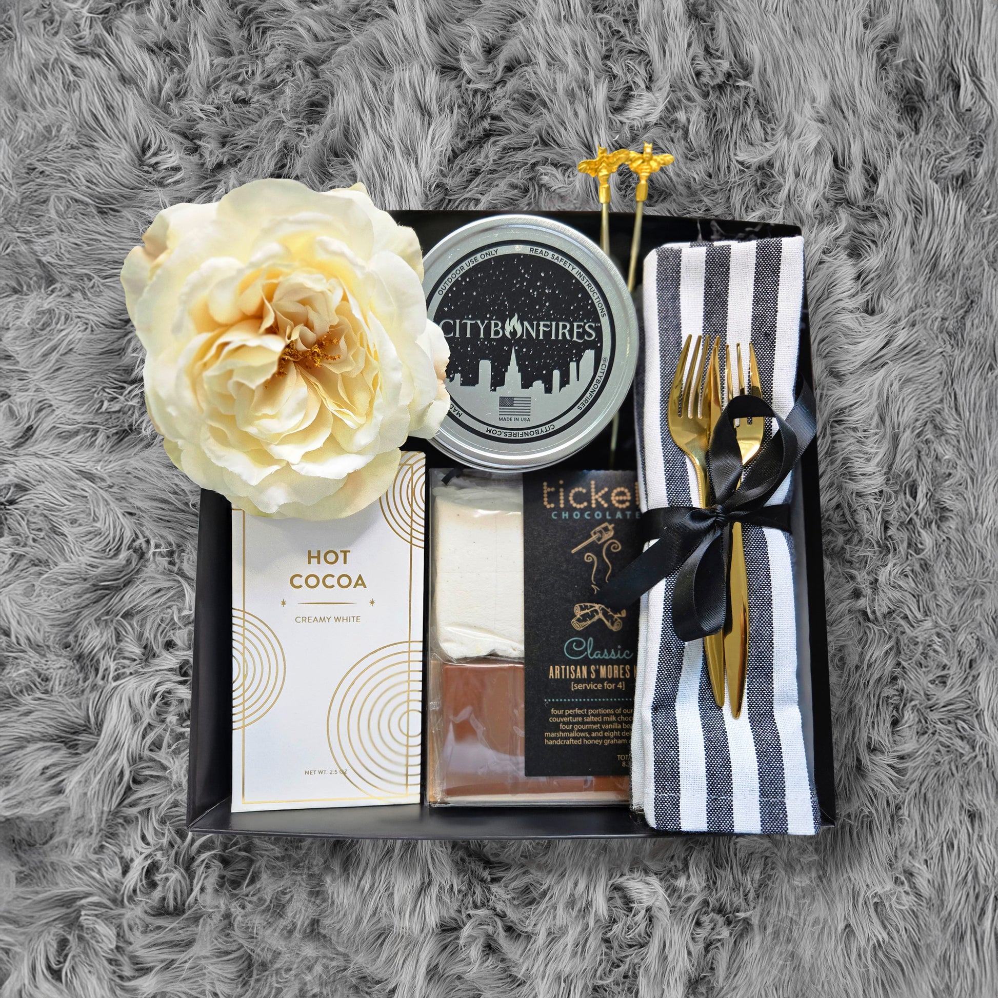 Whether you're glamping or sharing a cozy night in, this is the perfect collection. Handcrafted honey grahams, gourmet vanilla bean marshmallows, and couverture salted chocolate, paired with the smoothest hot chocolate and beautiful gold utensils, this artisan s'mores service for four is a hit that's always in season.